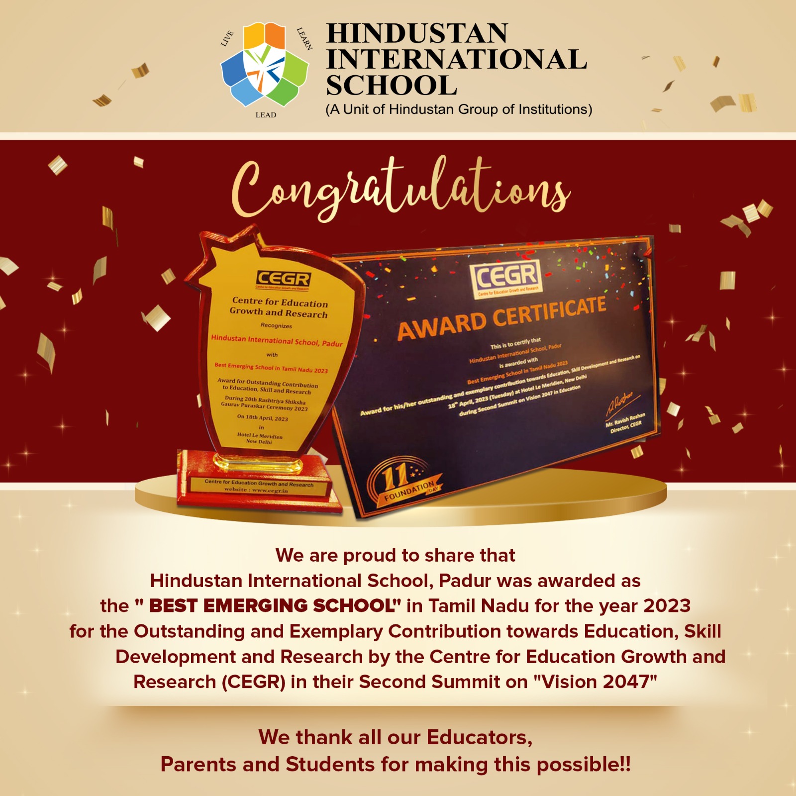 HIS Padur – The Best Emerging School in Tamil Nadu 2023View Details Padur Campus HIS Padur – The Best Emerging School in Tamil Nadu 2023We are proud to share that Hindustan International School , Padur was awarded as the "Best Emerging School" in Tamil Nadu for the year 2023Apr 18, 2023No Comments