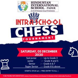 Intra School Online Chess Tournament-2020-2021View Details Padur Campus Intra School Online Chess Tournament-2020-2021Hindustan International School, Padur hosted an Intra School Online Chess tournament for the first time, to provide a platform for students...Dec 05, 2020